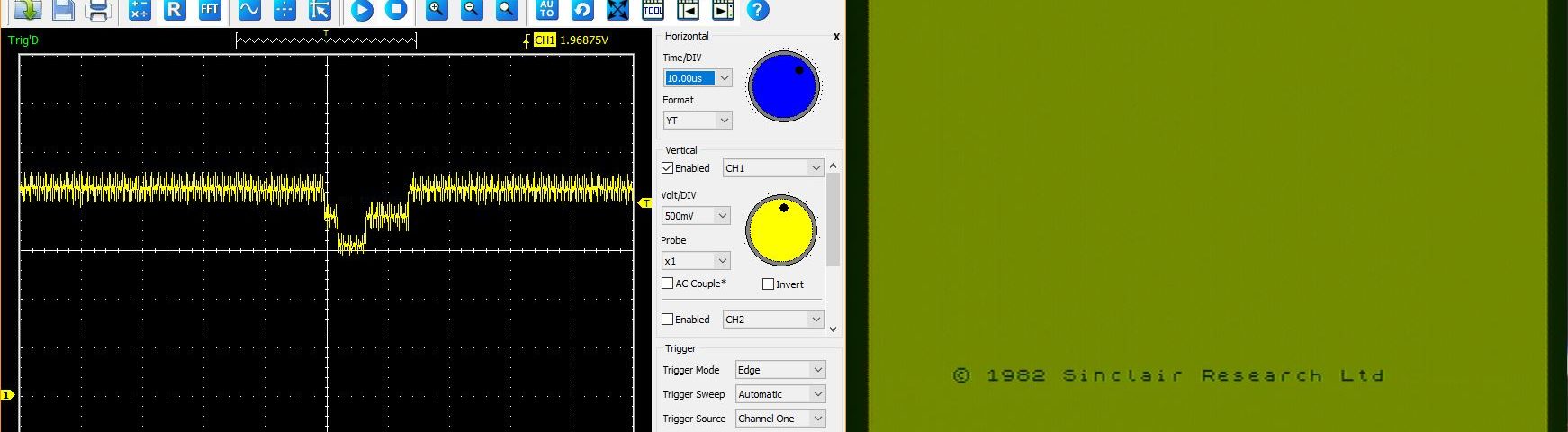 Adjustments are carried out by setting up the scope attached to the composite input wire into the modulator, and adjusting VR1/VR2 until the video output looks as ‘flat’ as possible, with no noise on the signal. It’s easiest to do this at the copyright message, as the back porch voltage drop against the white signal output is much easier to trigger against.